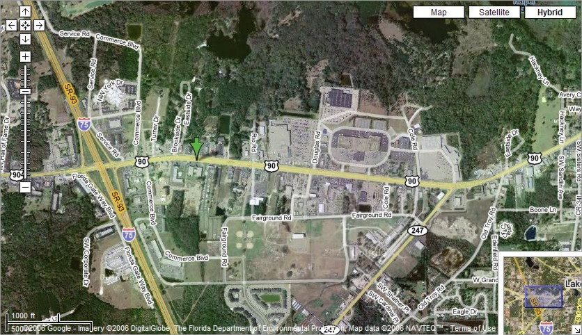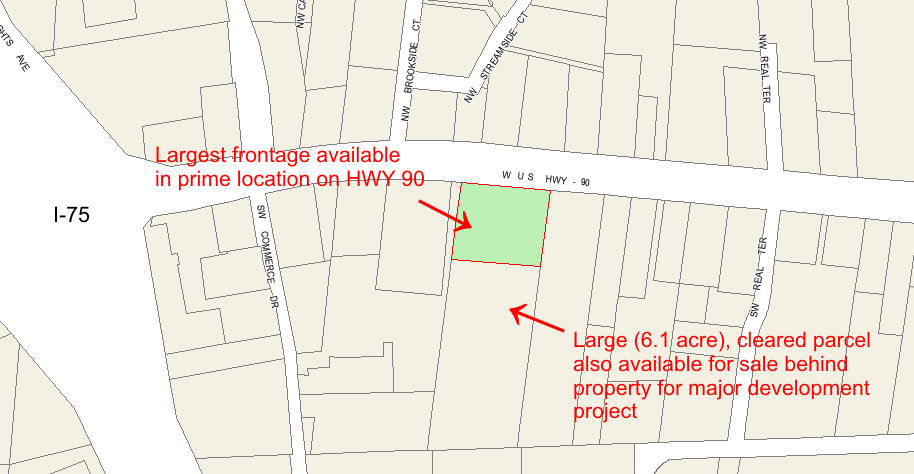 Geographical Specifics: High thru-traffic area due to I-10 and I-75 junction. Excellent piece of Florida real estate. The property is located along the south side of US Highway 90 West, approximately 1,500 feet east of Interstate 75, within the main development area of the city of Lake City, Columbia County, Florida. This commercial property has a sites address of 3072 US Highway 90 West, Lake City, Florida 32055.